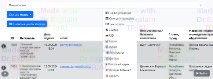 В таблице с участниками визуально можно получить следующую информацию: ID участнка, Фестиваль (куда подана заявка), Дата подачи заявки, email, Номер телефона, Имя участника / Название коллектива, Страна, город, Название студии, учреждения культуры/образования, ФИО педагога/концертмейстера/хореографа, Конкурсная программа, Автор, Жанр, Номинация, Категория, Возрастная группа, Уровень подготовки, Комментарий, Участников в номере, Оплата, Тип участия, Длительность номера.