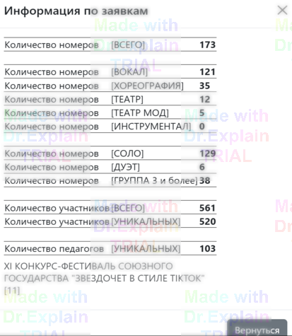 При нажатии кнопки "Информация по заявкам" появляется таблица с основными сводными данными по мероприятию: