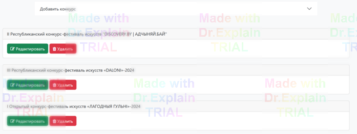 Для добавления мероприятия нажмите "Добавить конкурс" в самом верху экрана.Необходимо заполнить поля нужными данными: название, Даты проведения в формате "20 августа 2025 г." или "20.03.2025-22.03.2025" и т.д., в "Прием заявок по" необходимо вписать крайнюю дату приема заявок, впишите место проведения, описание сцен. площадки, жанры доступные к подаче (отредактировать будет невозможно), ввести данные о жюри, ввести специальные призы, вставить запрашиваемые ссылки и нажать "Добавить".