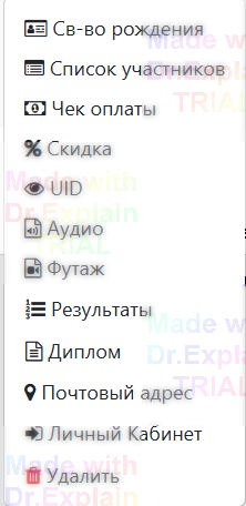 Просмотреть свидетельство о рождении, список участников, чек оплаты, сертификат на скидку, uID, аудио (минусовка), Футаж (видео, фото-заставка), перейти на страницу диплома и страницу результата, просмотреть почтовый адрес при заочном участии, войти в ЛК участника, удалить участника.
